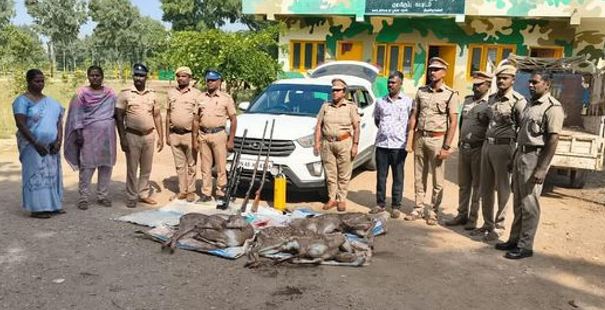 அப்போது, அவ்வழியே வந்த காரை நிறுத்தி சோதனையிட முயன்றபோது, காரில் இருந்தவர்கள் அங்கிருந்து தப்பியோடி விட்டனர். இதைத் தொடர்ந்து, காரைச் சோதனையிட்டபோது, அதில் 3 மான்களின் உடல்கள், 3 துப்பாக்கிகள் இருப்பது தெரிய வந்தது. இதுகுறித்து திருச்சி மாவட்ட வனத்துறைக்கு தகவல் தெரிவிக்கப்பட்டது.
