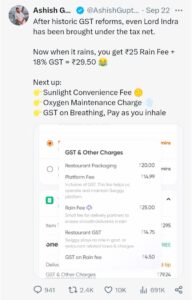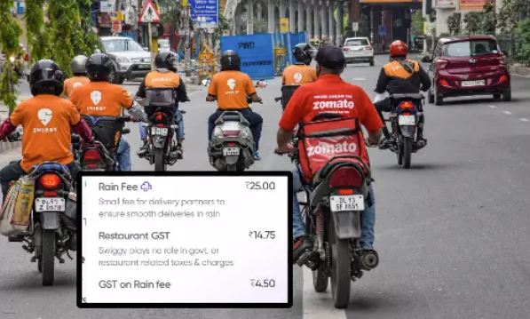 இந்நிலையில், முன்னணி ஆன்லைன் உணவு விநியோக நிறுவனங்களான ஸ்விக்கி, சொமேட்டோவில் மழை பெய்யும்போது உணவு டெலிவரி செய்தால் தனியாக வசூலிக்கப்படும் கட்டணத்திற்கும் தற்போது ஜிஎஸ்டி விதிக்கப்பட்டுள்ளது நெட்டிசன்களிடையே பேசுபொருளாகியுள்ளது.