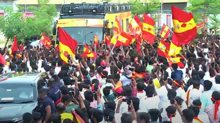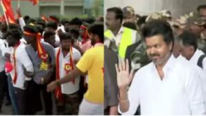 தடுப்புகளைத் தாண்டி விமான நிலையத்திற்குள் தொண்டர்கள் நுழைந்தனர். விஜய், பிரசார வாகனத்தில் ஏறி புறப்பட்டதும் அவரை ஏராளமான தொண்டர்கள் பின் தொடர்ந்தனர்.